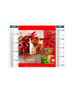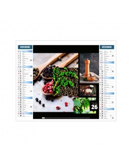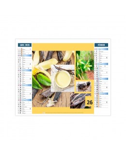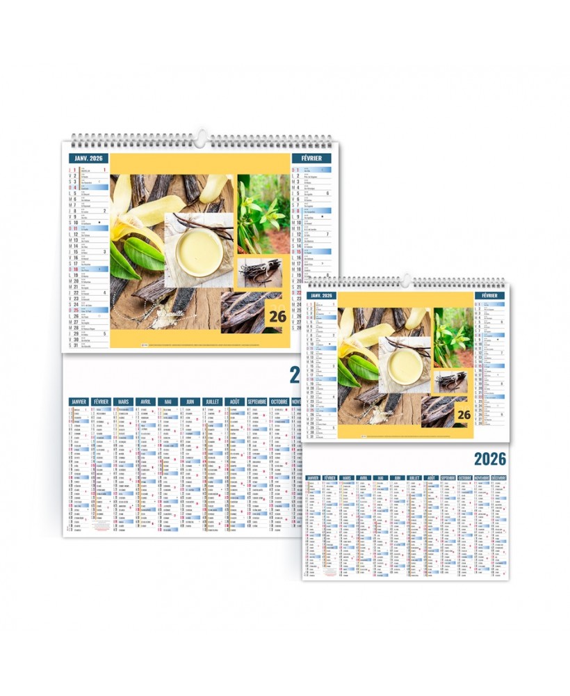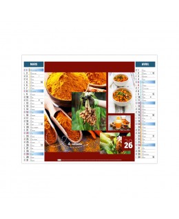 Calendrier publicitaire 6 feuillets 2026 avec planning de 12 mois illustré de 6 photos sur le thème des aromates. Ce calendrier est illustré de mosaïques de photographies comme la vanille, le curcuma, le sel, le poivre, le paprika ou la moutarde. Credit photographique: Adobe stock. Quantité minimum de 25 exemplaires. 2 possibilités au choix pour le format XXL 474 x 700 mm ou Small 330 x 470 mm. Impression 2 choix 1 couleur ou quadri. Ce calendrier se replie pour la mise sous pli.Prix sur devis.