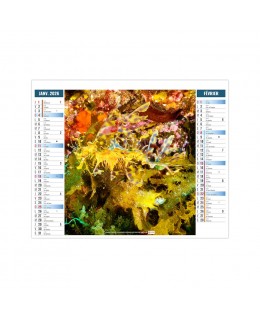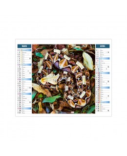 Calendrier publicitaire 6 feuillets 2026 avec planning de 12 mois illustré de 6 photographies sur le thème du camouflage. Dans la nature afin de préserver leur vie, certaines espèces se pigmentent en fonction de leur milieu. Amusez-vous à retrouver l'animal au fil des pages. Credit photographique: Art Wolfe / Art Wolfe.com. Quantité minimum à partir de 25 exemplaires. 2 formats au choix XXL 474 x 700 mm ou Small 330 x 470 mm. Impression quadri. Ce calendrier se replie pour la mise sous pli. Prix sur devis.