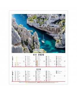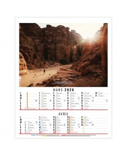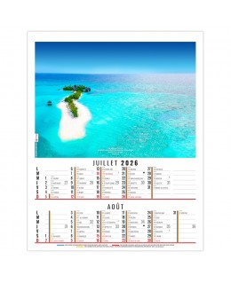Calendrier 2026 publicitaire 6 feuillets illustré de photographies de lieu à travers le monde où l'on se sent particulièrement privilégié d'y être seul dans ces paradis terrestre. Photographies: Hemis - Adobestock Photos - Unsplash. Ce calendrier est décliné en dos vide poche et calendrier spirale. Quantité minimum à partir de 25 exemplaires. Impression quadri. Prix sur devis.