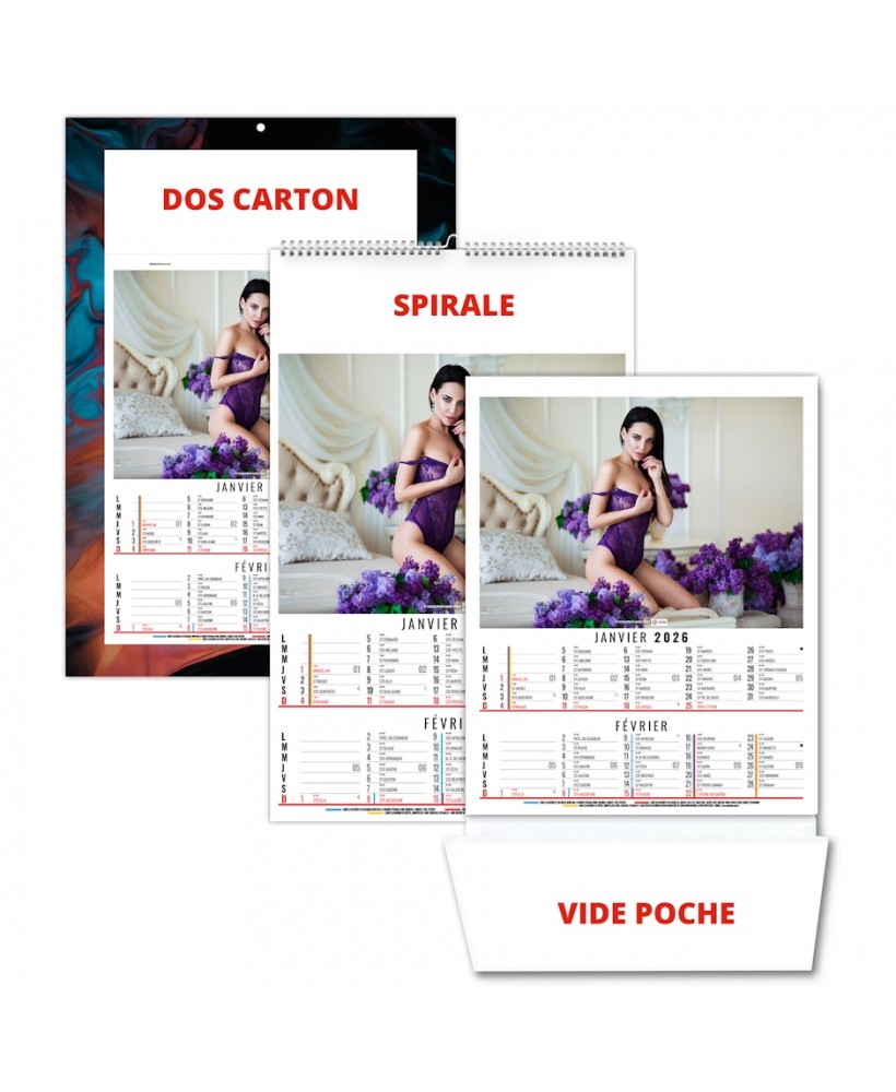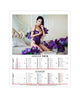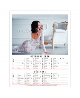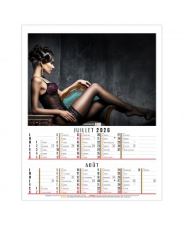 Calendrier 2026 publicitaire 6 feuillets illustré de photos de femmes vêtues de dessous de charme et chics. Ce calendrier se décline en dos carton, dos vide poche et calendrier spirale. Photos: Adobe Stockphotos. Quantité minimum à partir de 25 exemplaires. Impression quadri. Prix sur devis.