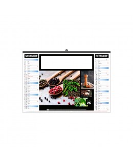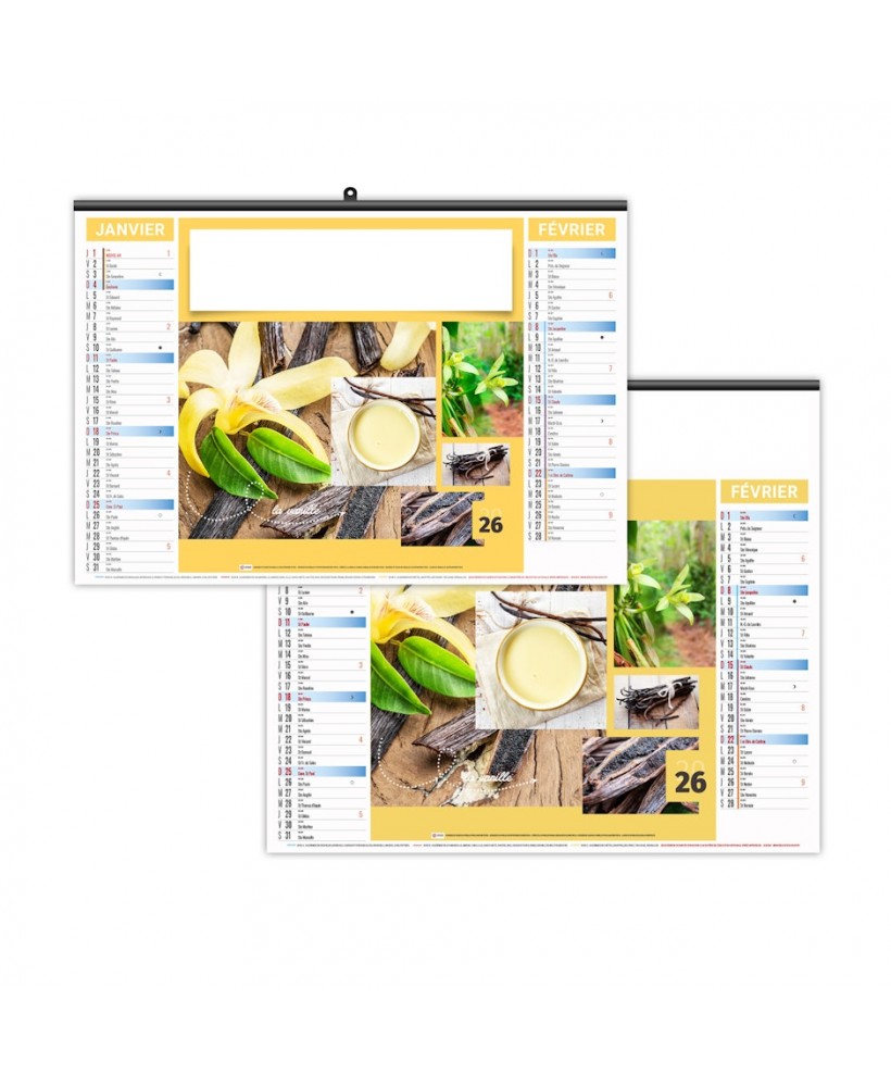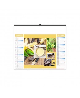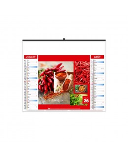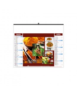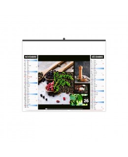 Calendrier publicitaire 2026 6 feuillets éco au format small ou XXL illustré de mosaïques de photos sur le thème des aromates et condiments. Photographies Adobestock - Unsplash. Quantité minimum: à partir de 25 exemplaires. 2 formats au choix: XXL format: 480 x 420 mm SMALL format: 480 x 330 mm. Impression choix entre 2 possibilités: 1 couleur ou quadri. Reliure: baguette métallique noire. Prix sur devis